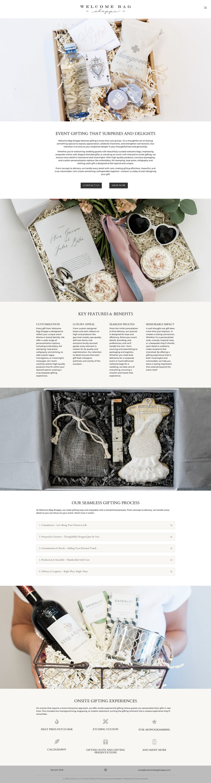 Earlier this year, we launched an elegant new website for Welcome Bag Shoppe, a Las Vegas-based brand specializing in custom, curated gift experiences for events and businesses. As a new name in the industry, they envisioned a website that reflected the same care and creativity they put into their gifts. So we put together a clean, elegant design that allows their beautifully crafted gifts to speak for themselves. You can check it out at welcomebagshoppe.com.